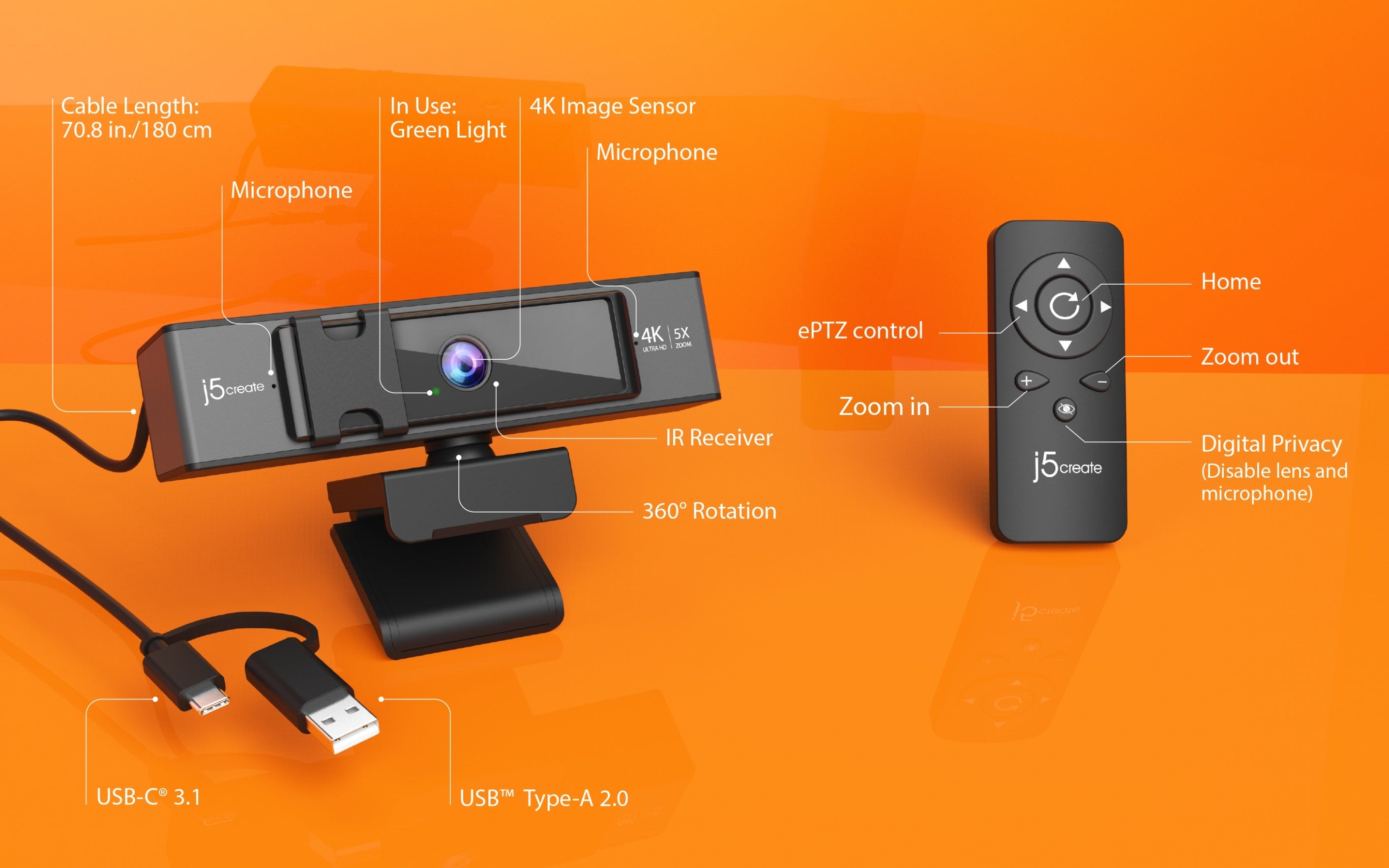 Веб-камера USB™ 4K ULTRA HD з 5-кратним цифровим зумом і пультом дистанційного керування підтримує функцію ePTZ (електронне панорамування, нахил і зум) за допомогою пульта дистанційного керування. Вона підтримує роздільну здатність 4K при 30 Гц і оптимізує відеодзвінки за допомогою 5-кратного цифрового зуму, що робить її ідеальною для зустрічей у великих конференц-залах, а також для використання однією особою. Крім того, веб-камера має вбудовану функцію поліпшення якості зображення при слабкому освітленні, вбудовані подвійний високоякісний мікрофон та два способи відключення об'єктива для забезпечення конфіденційності. Вона оснащена кабелем USB-C® і перехідником на USB™ Type-A для роботи як зі старими, так і з новими пристроями.