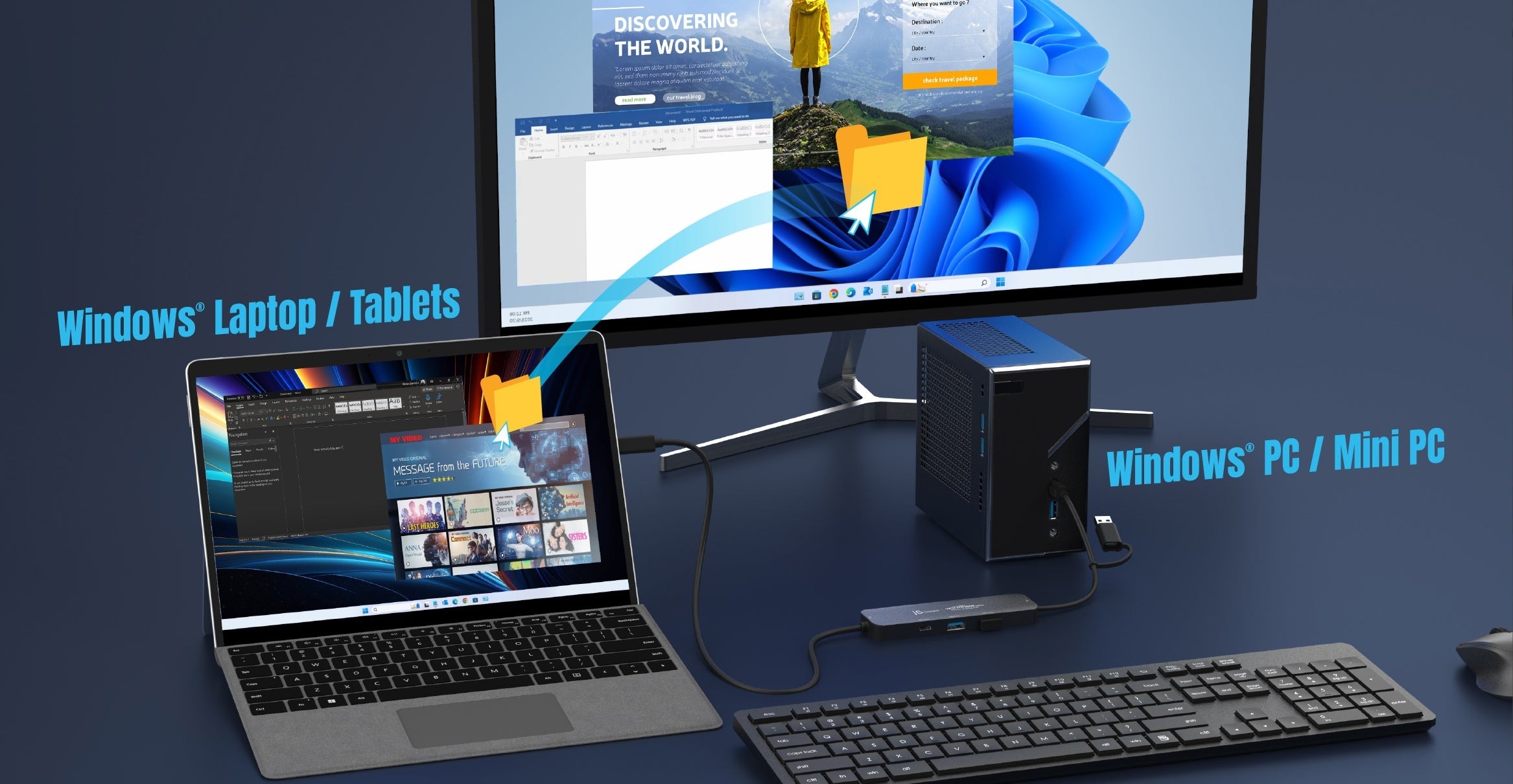 Концентратор для спільного використання дисплея Wormhole Switch™ — це ідеальний помічник для тих, хто працює на двох комп'ютерах під управлінням Windows®. Завдяки вбудованій функції KM (клавіатура та миша) ви можете легко керувати обома пристроями за допомогою клавіатури або миші, що значно спрощує переключення між завданнями. Безперешкодно обмінюйтеся файлами за допомогою перетягування або копіювання та вставлення, спрощуючи передачу даних — від документів до мультимедійних файлів.